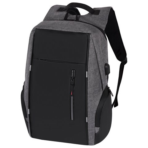 Выполнен из серого полиэстера с чёрной водоотталкивающей вставкой вдоль всей передней панели а также на боковых карманах, что гарантированно обеспечивает защиту техники и личных вещей от дождя и влаги.