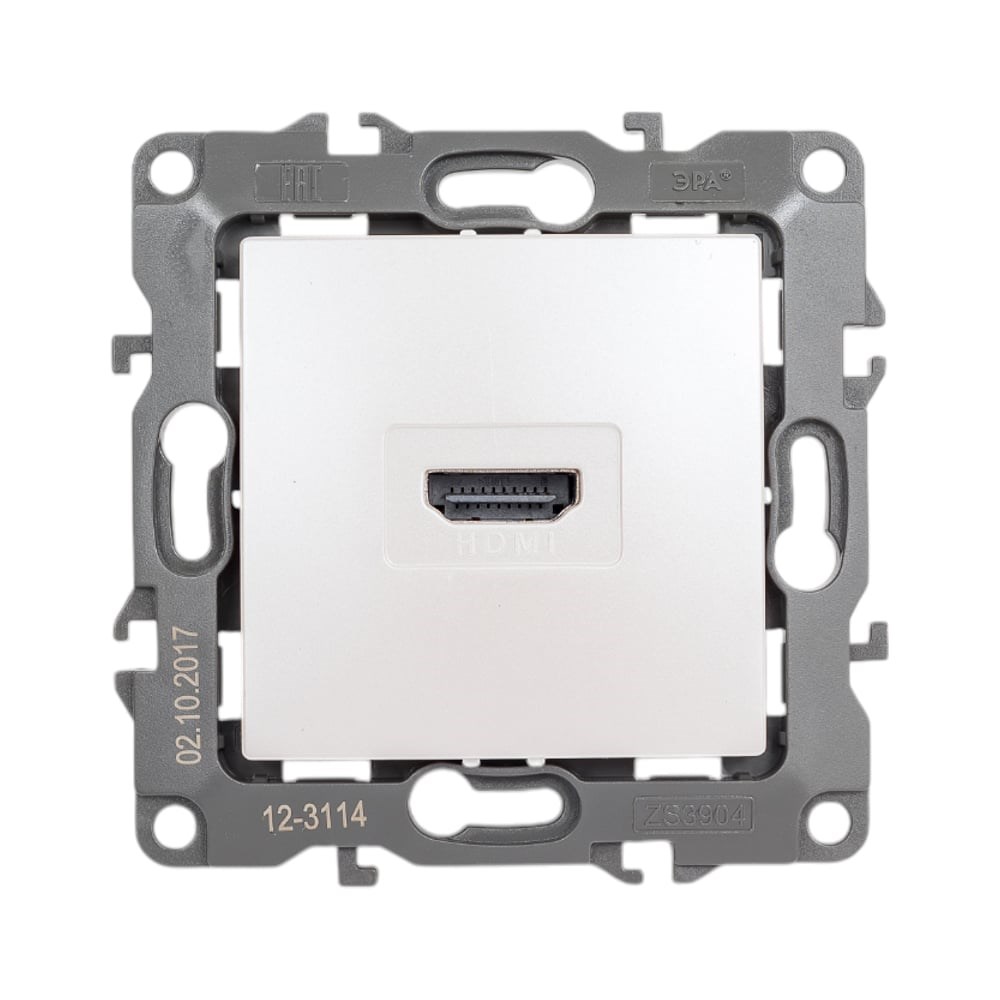 Розетка ЭРА 12-3114-15 HDMI, IP20, 12, перламутр Б0027490 сделана из поликарбоната. Монтаж в подрозетник производится и на лапки, и на винты. Рамки приобретаются отдельно.