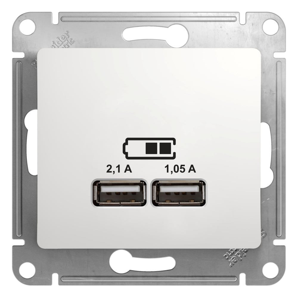 Механизм Systeme Electric (ранее Schneider Electric) серии Glossa (цвет белый) розетки с двумя разъёмами USBс выходными напряжением 5 В постоянного тока и выходами с номинальным током по 2,1 Апредназначен для зарядки мобильных устройств: телефоны, планшетные компьютеры, mp3/mp4 плеерыможет заряжать одно или два устройства одновременновыполнен из материала PС+ASA, стойкого к УФ-излучению и появлению царапин