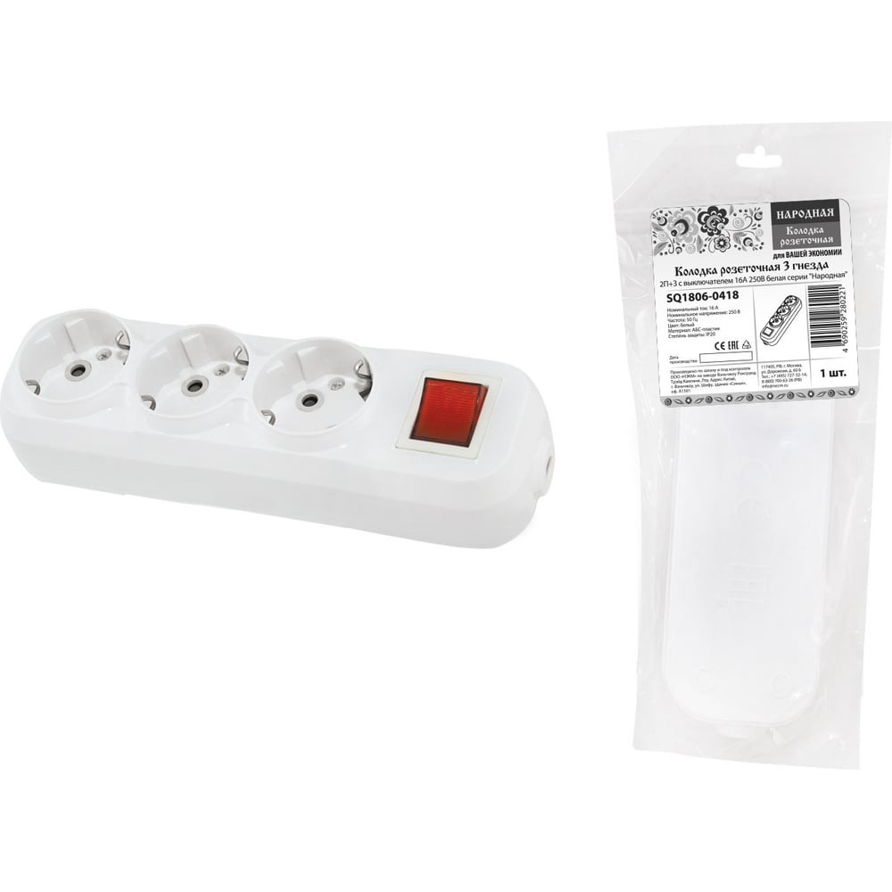 Розеточная колодка TDM ELECTRIC 3 гнезда 2П+3 с выключателем 16А 250В белая серии Народная SQ1806-0418