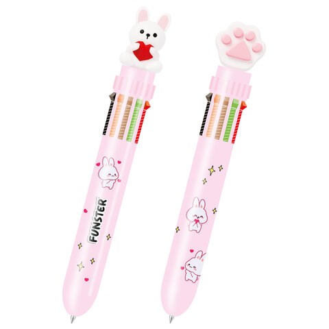 Ручка многоцветная FUNSTER "WOW" включает целую палитру цветов в одном корпусе и оснащена десятью стержнями: синий, черный, красный, зеленый, голубой, розовый, оранжевый, фиолетовый, желтый, коричневый. Простое переключение кликом между стержнями позволит делать записи и выделять важные заметки еще проще и быстрее. Блестящий корпус ручки с изображением забавных кроликов привлечет к себе особое внимание. Ручка дополнена дополнена очаровательными топперами ассорти: обаятельный крольчонок с сердечком и милая лапка. Удобный пишущий узел 0,7 мм обеспечит тонкую линию письма толщиной 0,35 мм.