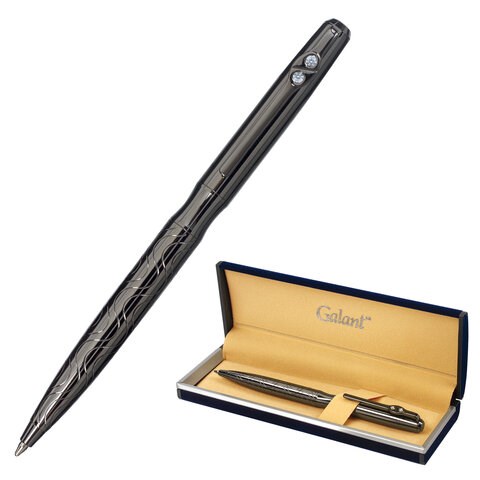 Изящная модель ручки с корпусом из латуни цвета оружейного металла с декоративным узором и кристаллами. Синий цвет чернил; длина стержня составляет 98 мм, а диаметр пишущего узла - 0,7 мм. Поставляется в индивидуальном подарочном футляре. Подходит для гравировки.