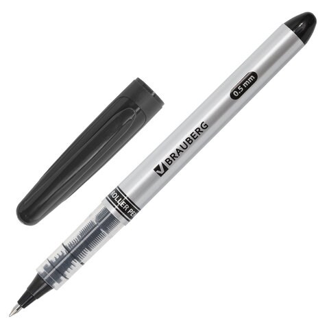 Ручка-роллер BRAUBERG "Control", ЧЕРНАЯ, корпус серебристый, узел 0,5 мм, линия письма 0,3 мм, 141553