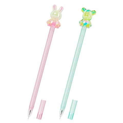 Ручка представлена в двух оригинальных дизайнах, привлекающих особое внимание. Розовый корпус дополнен акриловым топпером в форме зайчонка. Корпус голубого цвета украшает фигурка в форме медвежонка. Акриловые топперы переливаются мягким блеском, что придает им особый шарм. Стержень со стандартным наконечником 0,7 мм создает аккуратную линию письма толщиной 0,35 мм. Синий цвет чернил - универсально как для ведения записей в процессе учебы или работы, так и для создания личных заметок.
