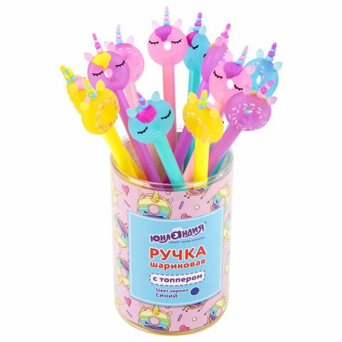 Ручка с топпером шариковая ЮНЛАНДИЯ "Единорог-пончик", корпус ассорти, СИНЯЯ, пишущий узел 0,7 мм, 143803