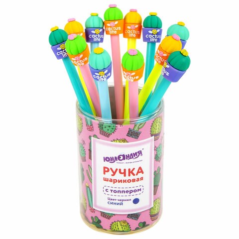 Ручка с топпером шариковая ЮНЛАНДИЯ "Кактус", корпус ассорти, СИНЯЯ, пишущий узел 0,7 мм, 143800