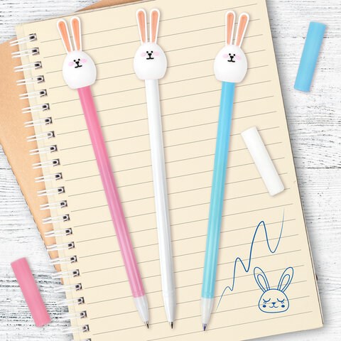 Ручка с топпером шариковая ЮНЛАНДИЯ "Ушастый зайка", корпус ассорти, СИНЯЯ, пишущий узел 0,7 мм, 143782