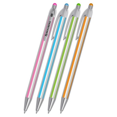 Ручка шариковая автоматическая BRAUBERG "Stripes", СИНЯЯ, корпус ассорти, пишущий узел 0,5 мм, линия письма 0,3 мм, 144219