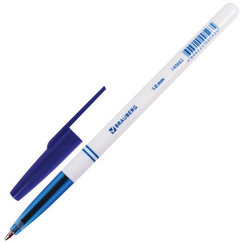 Ручка шариковая BRAUBERG "Офисная", СИНЯЯ, корпус белый, узел 1 мм, линия письма 0,5 мм, 140662