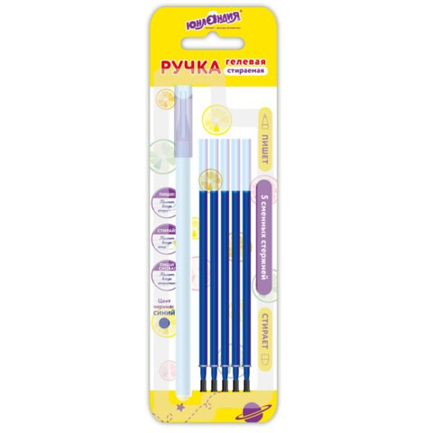 Ручка стираемая гелевая ЮНЛАНДИЯ "Лимонад", СИНЯЯ, + 5 сменных стержней, прорезиненный корпус, узел 0,5 мм, линия письма 0,35 мм, 144241