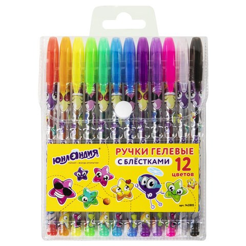 Ручки гелевые ЮНЛАНДИЯ, НАБОР 12 ЦВЕТОВ, БЛЕСТКИ, корпус с печатью, узел 0,7 мм, линия письма 0,5 мм, 142805
