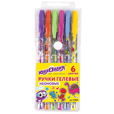 Ручки гелевые ЮНЛАНДИЯ, НАБОР 6 ЦВЕТОВ, НЕОН, корпус с печатью, узел 0,7 мм, линия письма 0,5 мм, 142804