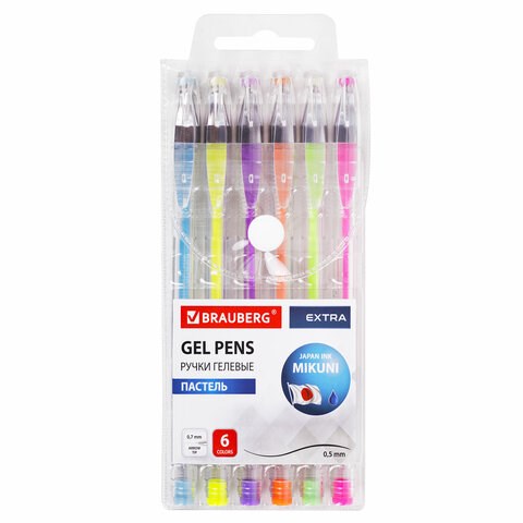 Ручки гелевые ПАСТЕЛЬ BRAUBERG "EXTRA", НАБОР 6 ЦВЕТОВ, узел 0,7 мм, линия 0,5 мм, 143910