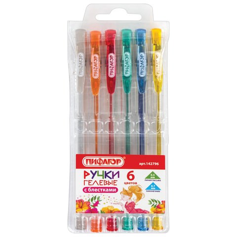 Ручки гелевые ПИФАГОР, НАБОР 6 ЦВЕТОВ, БЛЕСТКИ, корпус прозрачный, узел 0,7 мм, линия письма 0,5 мм, 142796