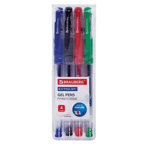 Ручки гелевые с грипом BRAUBERG "EXTRA GT", НАБОР 4 ЦВЕТА, стандартный узел 0,5 мм, линия письма 0,35 мм, 143923