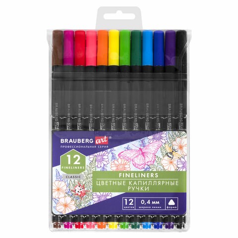 Набор капиллярных ручек BRAUBERG ART "Classic" состоит из 12 ярких цветов: красный, коричневый, синий, черный, желтый, зеленый, розовый, голубой, сиреневый, фиолетовый, салатовый, оранжевый.