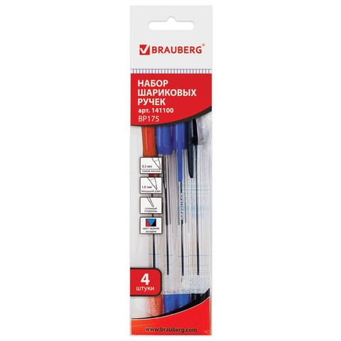 Ручки шариковые BRAUBERG, НАБОР 4 шт., АССОРТИ, "Line", узел 1 мм, линия письма 0,5 мм, 141100
