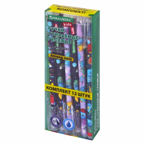 Ручки стираемые гелевые BRAUBERG KIDS "AMONG CATS", СИНИЕ, КОМПЛЕКТ 12 ШТУК, игольчатый наконечник 0,5 мм, линия 0,35 мм, 144099