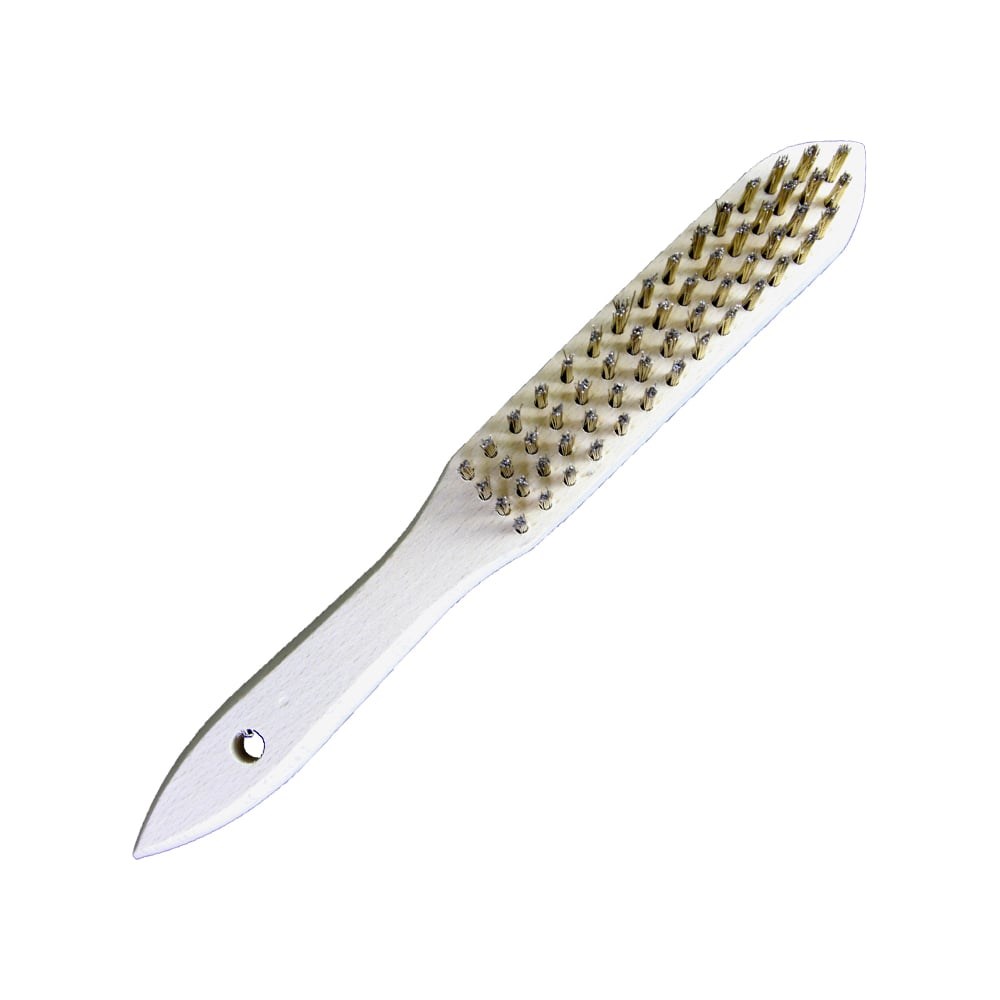 Ручные щетки предназначены для обработки металла, камня, бетона, дерева и других материалов. В основном применяются для зачистки от старой краски, удаления ржавчины, обработки сварных швов и т.п. работ. Ворс из прямой стальной проволоки диаметром 0,35 мм агрессивен в работе, но благодаря латунному напылению он чуть мягче, чем просто стальной и менее подвержен окислению при хранении. Материал корпуса: дерево Форма ручки: прямая Кол-во рядов ворса: 4 Длина корпуса L (мм): 295 Длина рабочая A (мм): 145 Материал ворса щетки: сталь черная латунированная Диаметр ворса (мм): 0,35 Тип (форма) ворса: прямой Длина ворса T, S (мм): 25