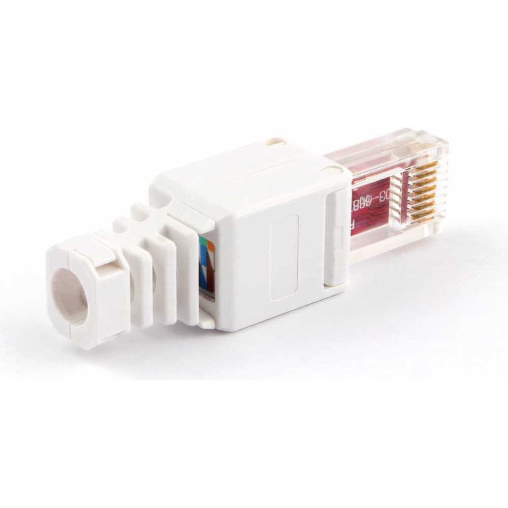 Монтаж на кабель витая пара осуществляется руками с помощью специальных зажимов/ножей внутри корпуса джека. Благодаря современной конструкции, кабель надежно фиксируется, что исключает его выпадения из джека. Данный вариант прекрасно подойдет в тех случаях, когда нужно заменить один или два джека, и хочется обойтись без покупки дорогостоящего обжимного инструмента. Штекер изготовлен из качественного пластика и имеет золотое напыление на ножах для улучшения контакта с жилами кабеля. Продается в индивидуальной упаковке.