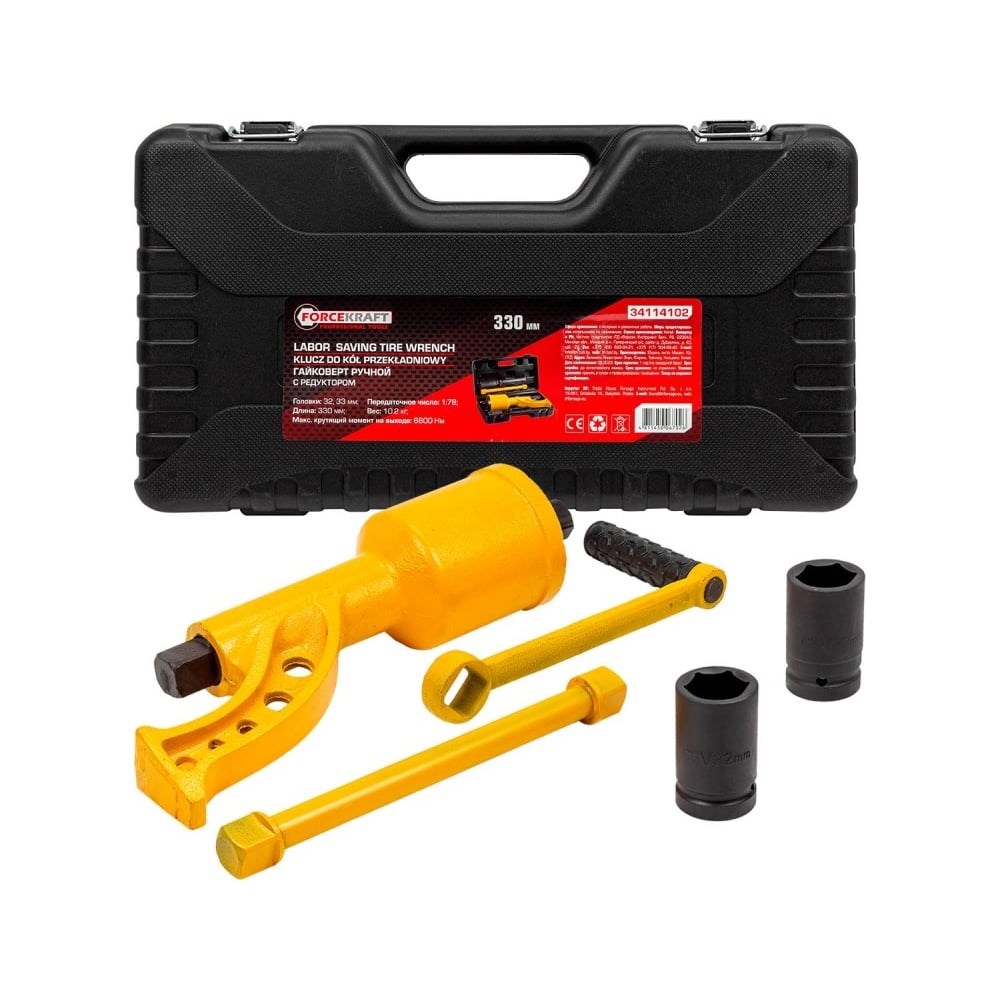 Ручной гайковерт с редуктором размером 1" от бренда Forcekraft обладает рядом значительных преимуществ, которые делают его идеальным инструментом для профессионалов и домашних мастеров:Высокое передаточное отношение. Передаточное отношение 1:78 позволяет значительно увеличивать прикладываемую силу: на 1 кг усилия инструмент может обеспечить до 78 кг, что упрощает процесс откручивания и закручивания болтовых соединений.Максимальный крутящий момент. 6800 Нм — максимальный крутящий момент, что позволяет легко работать с крепежными элементами, требующими больших усилий.Комплектация:В комплект входят две головки размером 32 мм и 33 мм, что расширяет возможности использования инструмента.Пластиковый кейс для удобного хранения и переноски.Прочная конструкция. Механический усилитель крутящего момента имеет простую и прочную конструкцию, что обеспечивает долговечность инструмента.Комфорт в использовании. Удобная нескользящая ручка обеспечивает комфортное использование, что особенно важно при выполнении трудоемких работ.Универсальность:Идеален для профессиональных механиков, автослесарей и домашних мастеров, занимающихся ремонтом и обслуживанием автомобилей.Подходит для любых работ, требующих больших усилий при затягивании или ослаблении крепежных элементов.Эффективность. При вращении ручки приводится в движение стержень с закрепленной головкой, что делает процесс работы с резьбовыми соединениями быстрым и легким.ПрименениеЭтот инструмент идеально подходит для:Профессиональных механиков.Автослесарей.Домашних мастеров, занимающихся ремонтом и обслуживанием автомобилей.Других работ, требующих больших усилий при затягивании или ослаблении крепежных элементов.Ручной гайковерт сочетает в себе мощность, удобство и универсальность, что делает его незаменимым инструментом в арсенале любого мастера.