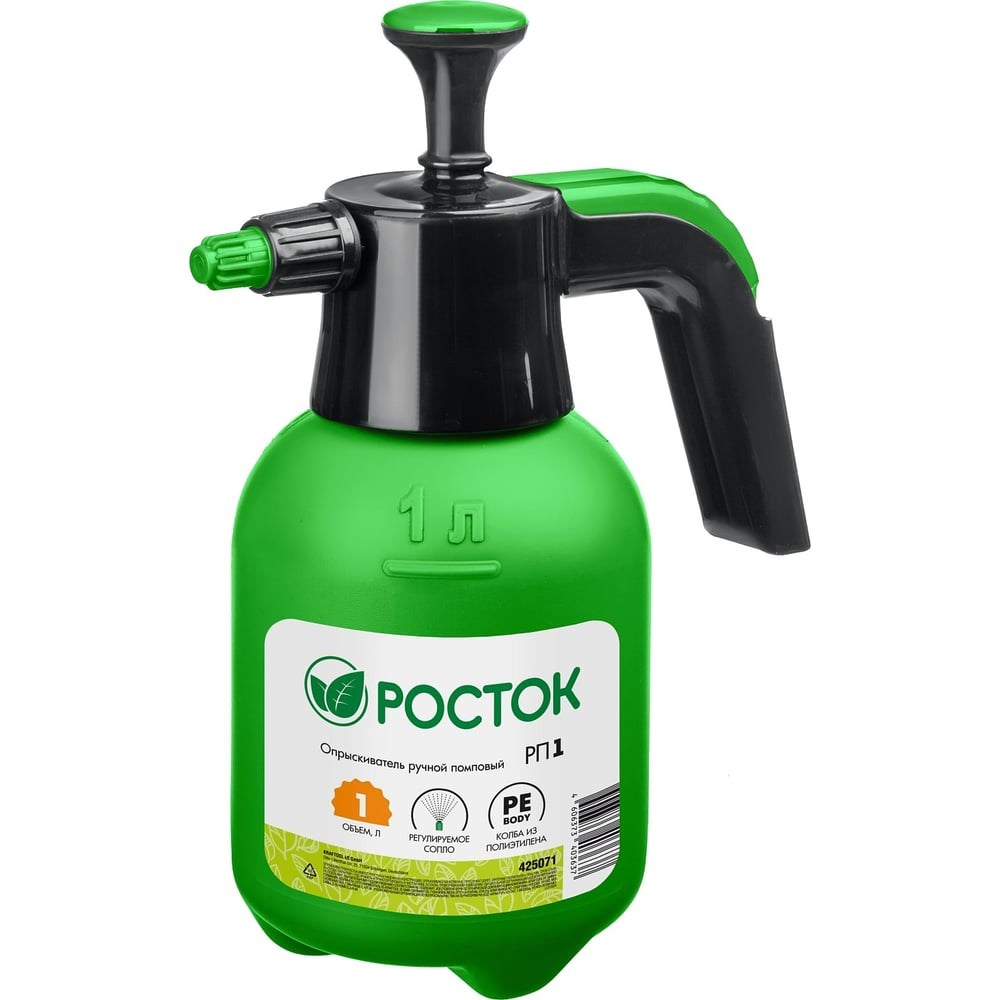 Ручной помповый опрыскиватель РОСТОК РП-1 1 л 425071 предназначен для дезинфекционных работ и ухода за растениями в овощеводстве, садоводстве, цветоводстве. Удобство использования. Форма рукояти позволяет комфортно держать распылитель. Колба изготовлена из полиэтилена, благодаря чему отличается небольшим весом и устойчивостью к ударам.