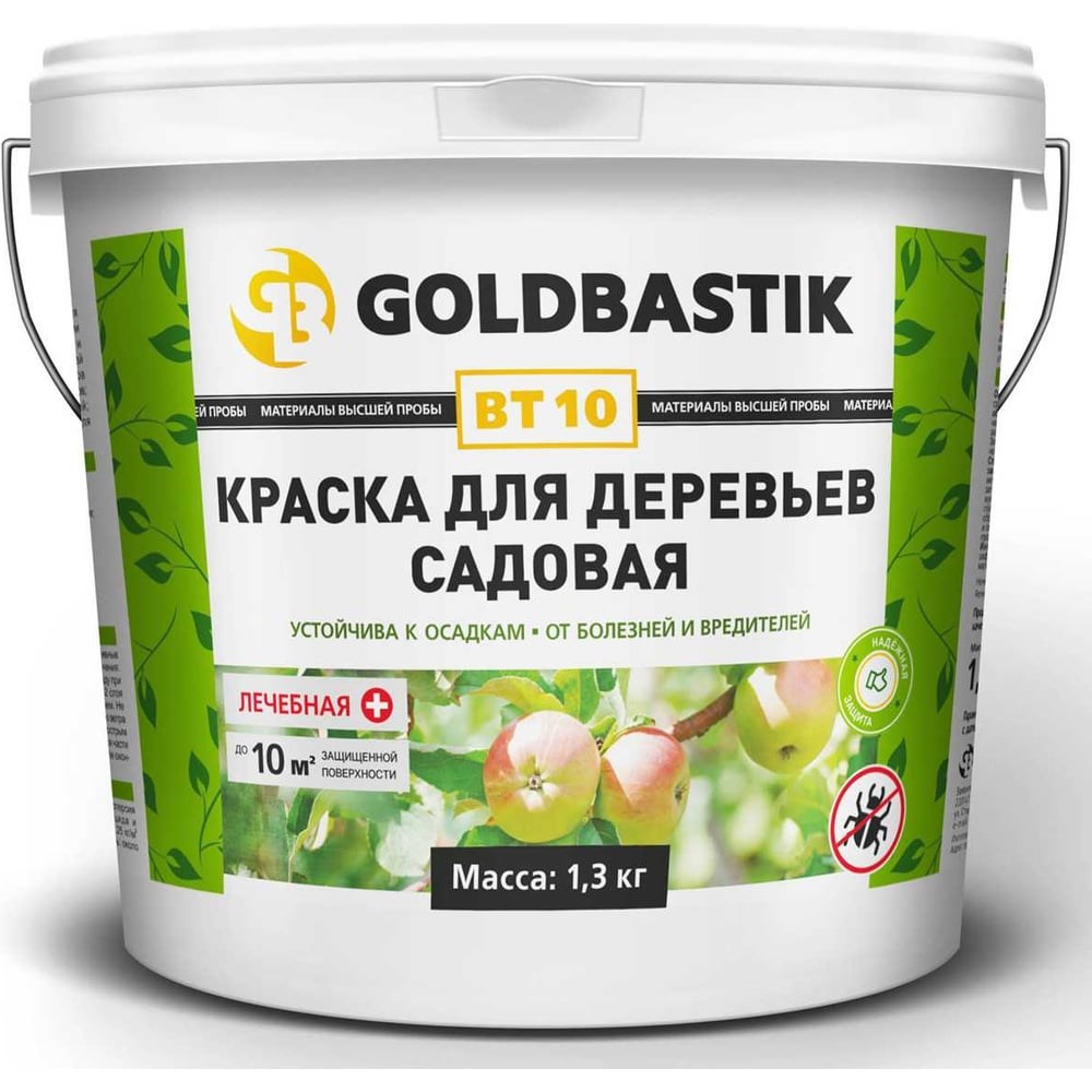 Краска для деревьев садовая GOLDBASTIK BТ 10 — биотехническое средство для замазывания распилов, а также для лечебно-профилактической окраски и дезинфекции стволов и ветвей садовых деревьев и кустарников, как плодовых, так и декоративных. Оно применяется для защиты и лечения от возбудителей болезней, защищает кору от резких перепадов температур, способствует заживлению ран, препятствует развитию мхов и лишайников на дереве или кустарнике, а также защищает от зимующих насекомых-вредителей. Краску можно совмещать с другими средствами защиты растений. Она безвредна для теплокровных существ и полезных насекомых. Применение препарата не приводит к санитарно-опасным загрязнениям почвы, растений, воздушной среды и сточных вод.