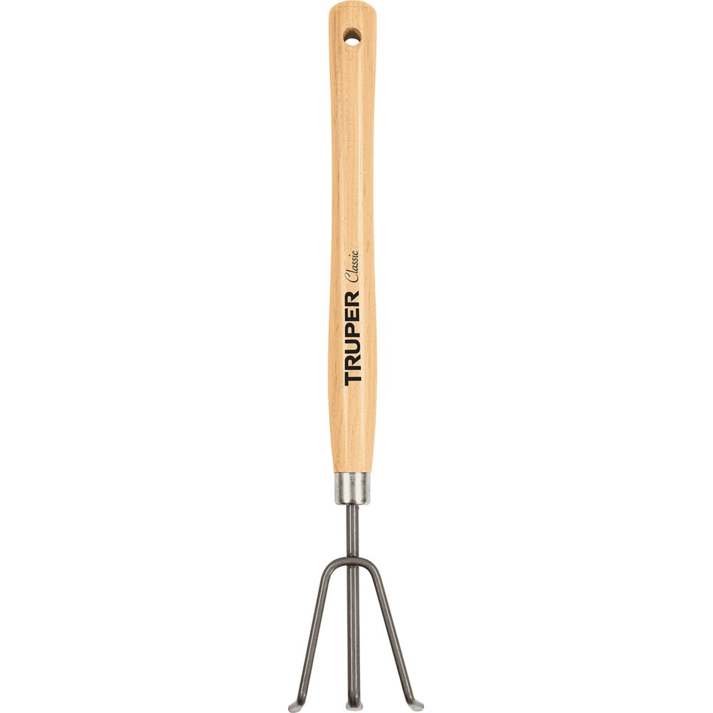Садовый культиватор Truper GTL-CV 15036 используется для ручной аэрации почвы на грядках и клумбах. Инструмент прост и удобен в работе. Он состоит из металлической рабочей части с тремя зубцами и деревянной ручки, которая надежно закреплена в манжете.