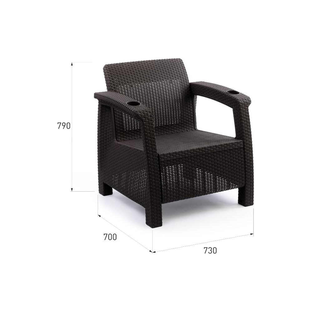 Кресло произведено из высококачественного полипропилена, имитирующего плетение из ротанга. Кресло имеет одно посадочное место, допустимая нагрузка на одно посадочное место - 106 кг . На подлокотниках дивана расположены отверстия для напитков. Кресло может стать идеальным решением по оформлению зоны отдыха в доме, на садовом участке, в офисном помещении или в кафе. Подушки для сидения в комплект не входят.
