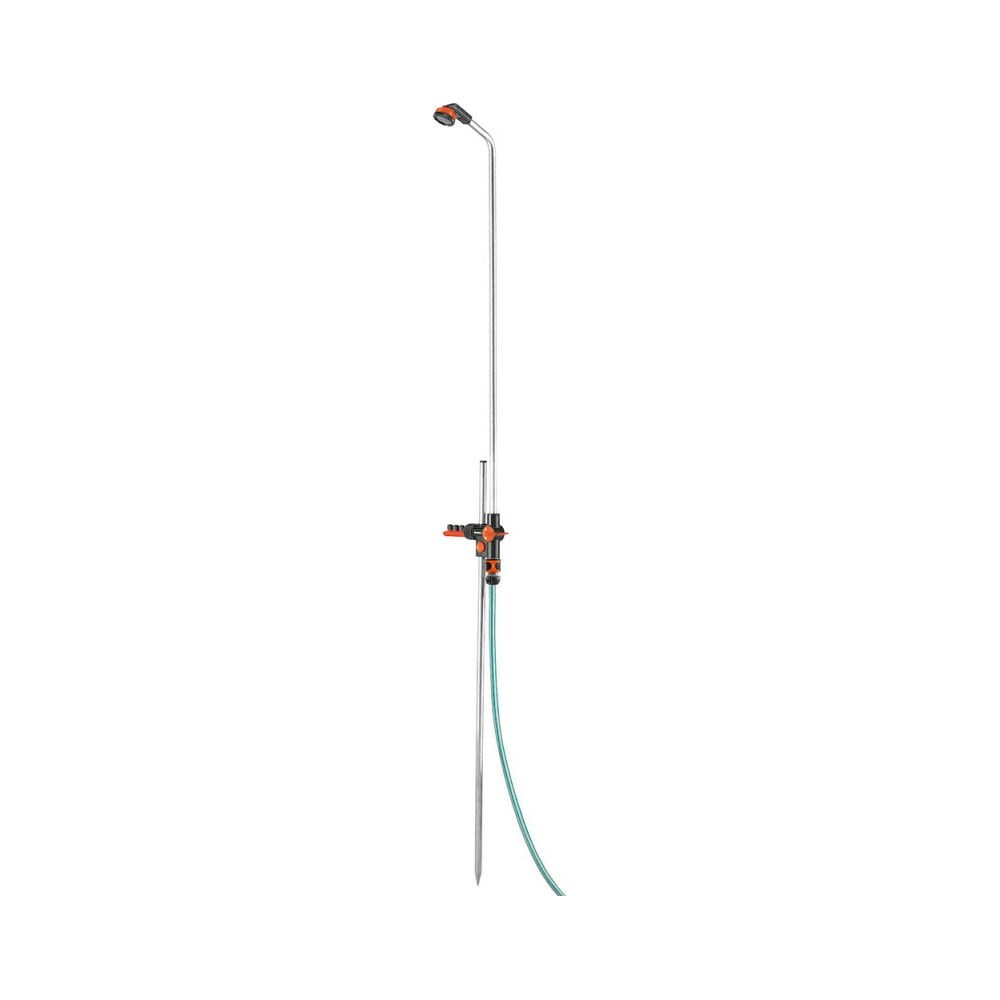 Садовый душ Gardena 00959-20.000.00 поставляется с алюминиевым легким и прочным штативом длиной около 220 см. Для работы душа необходимо просто подключить шланг уличного водопровода с напором, желательно, не менее 1 Атм. Штатив разделен на две части, и в месте стыковки можно регулировать общую высоту уличного садового душа. Душевая лейка несъемная, а излив воды производится в режиме комфортный душ. Также доступен режим мелкодисперсного распыления, который проводится через три форсунки установленных в середине штатива. Поворотный регулятор может менять напор воды, а также пологостью перекрывать проток.