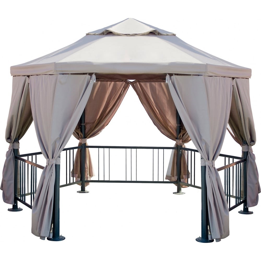 Садовый тент из полиэстера с металлическим каркасом Green Glade 1080 выполняет функцию беседки. Шестиугольная форма, прочный металлический каркас со специальными опорами и система крепежей обеспечивает высокий уровень устойчивости. Изготовлен из полиэстера, которой устойчив к износу, загрязнению и не требует дополнительного ухода. Оснащен шестью москитными сетками, которые предотвращают проникновение назойливых насекомых внутрь и защищают укусов.
