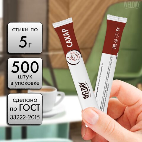 Сахар порционный WELDAY (ВЭЛДЭЙ) в стиках по 5 г, 500 штук, 622494