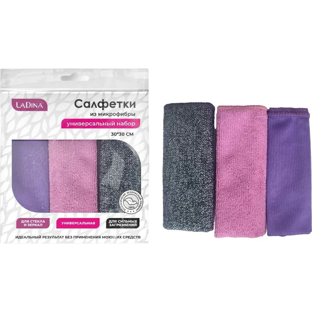 Набор салфеток из микрофибры Ladina 30х30 см, 3 шт. 200002 обладает впечатляющей гигроскопичностью. Впитывают в 7 раз больше влаги, чем их собственный вес. При этом не развозят грязь по поверхности, не оставляют полос и ворса. Салфетка из микрофибры подходит для очищения совершенно любых поверхностей — зеркал, стекол, ламината, пластиковых подоконников, сантехники. Эффективно притягивает мельчайшие частички пыли за счет статического электричества. Не имеет конкурентов в уборке.