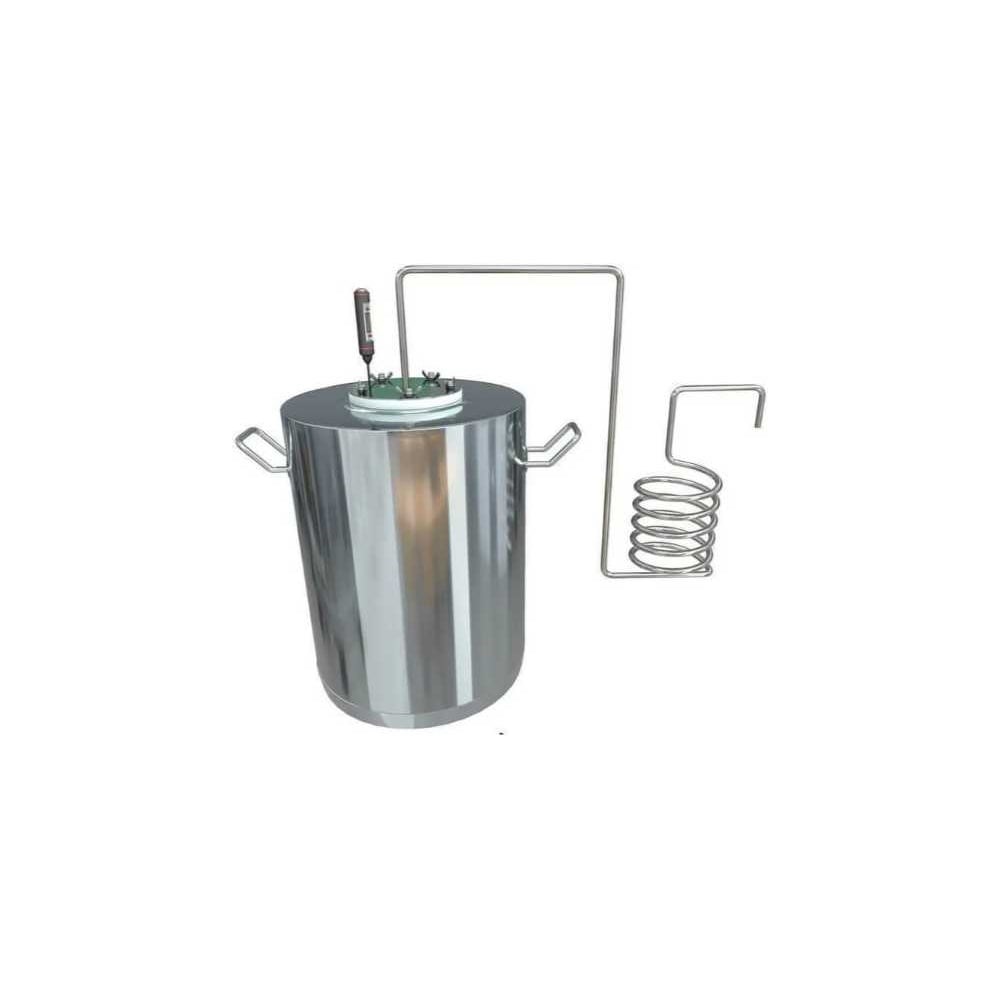 Материалнержавеющая сталь. Самогонный аппарат Дачный - непроточного типа.На нем можно перегонять брагу там, где нет водопровода: в саду; на даче; в деревне. Характеристики: Перегонный куб 30 л Толщина стенок 1 мм Толщина дна 2 мм Змеевик помещается в ведро с холодной водой или снегом. Спиртовые пары охлаждаются и конденсируются точно так же, как в холодильнике проточного типа.Конструкция - простейшая и понятная. Такой аппарат подойдет даже начинающему самогонщику. диаметр змеевика - 7,5 мм; количество витком - 5; сталь AISI 304 (пищевая). Бак также выполнен из пищевой нержавеющей стали. Диаметр фланца 110 мм. Фланец крепится на 5 барашков.