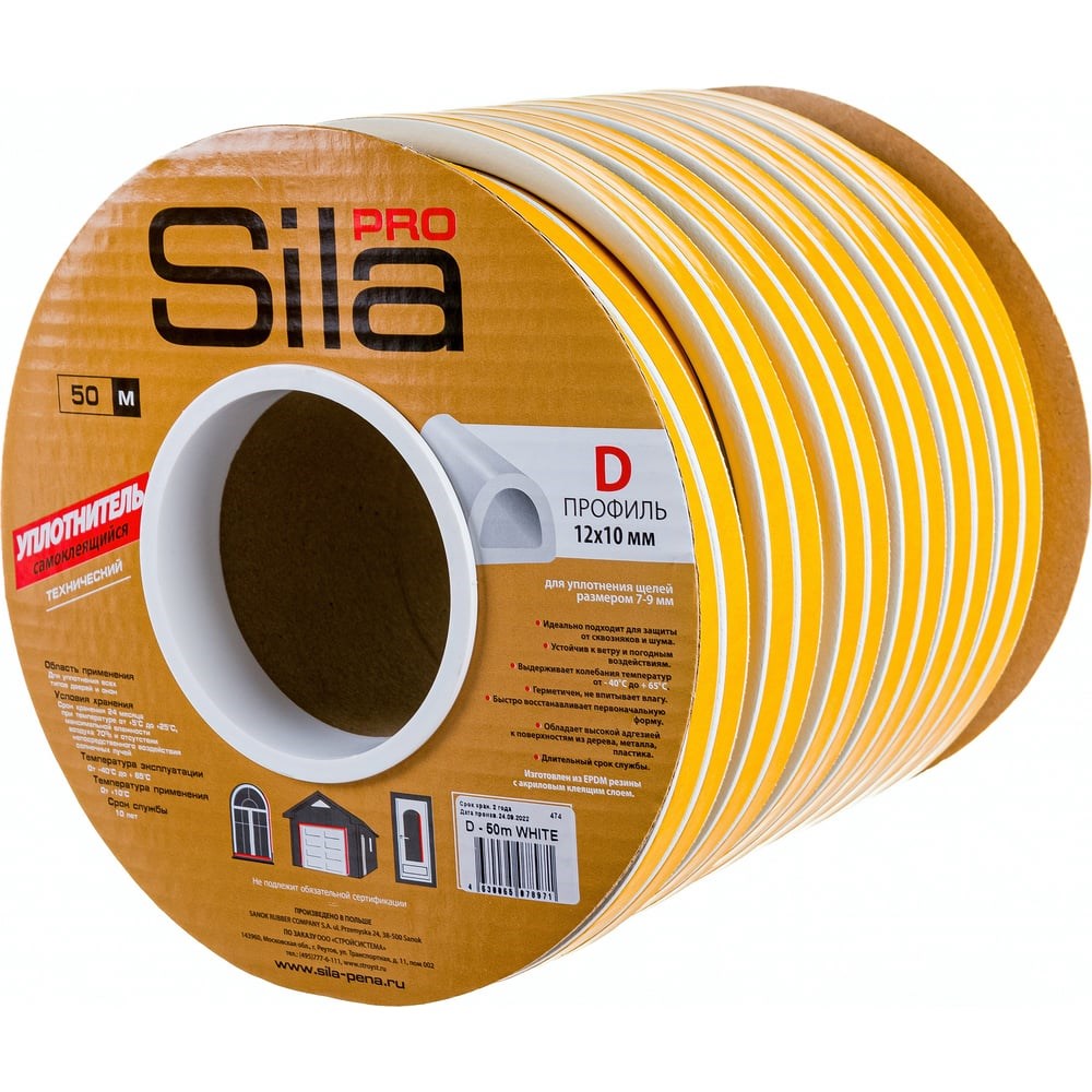 Самоклеящийся уплотнитель Sila Pro D изготовлен из высококачественной EPDM-резины с акриловым клеевым слоем. Произведено в Польше.Преимущества:Защищает от сквозняков, пыли и шумаУстойчив к УФ-излучению и перепадам температур от -40°C до +65°CНе оставляет следов при демонтажеПолностью восстанавливает форму после сжатияСрок службы до 10 летПрименение:Уплотнения оконных рам и дверных блоковГерметизации стыков в мебельных конструкцияхЗащиты от теплопотерь и шума