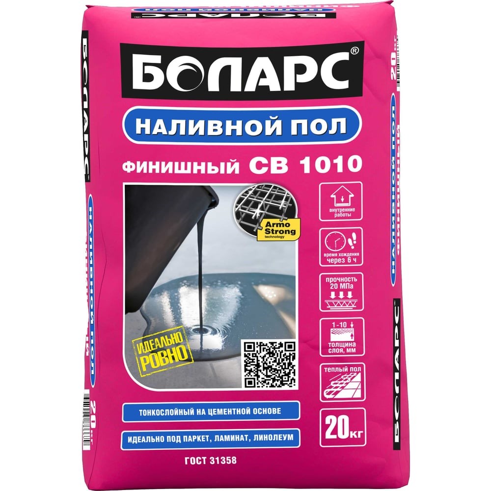 Самовыравнивающийся пол БОЛАРС СВ-1010 20 кг 00000022366 финишный наливной пол применяется для устройства выравнивающих слоев под дальнейшую укладку напольных покрытий (керамическая и керамогранитная плитка, текстильные ковры, линолеум, паркет, ламинат, паркетная доска и т.п. напольные покрытия). Применяется в жилых и общественных зданиях (с нагрузкой на пол не более 200 кгс/см²) по основаниям: монолитный бетон, цементные, цементно-песчаные и гипсопесчаные основания. Подходит для сухих помещений и помещений с умеренным уровнем влажности (кухни, ванные комнаты, санузлы). Рекомендуется для применения в системе “теплый пол”. Изготовлен на основе специальных цементов с использованием высокоэффективных полимерных и модифицирующих добавок. Усилен армирующими волокнами. Предназначен для нанесения ручным и машинным способом. Средний расход 1,6 кг/м² на 1 мм толщины слоя наливного пола. Расход зависит от рельефа основания. Срок хранения в сухом помещении в ненарушенной заводской упаковке - 12 месяцев.