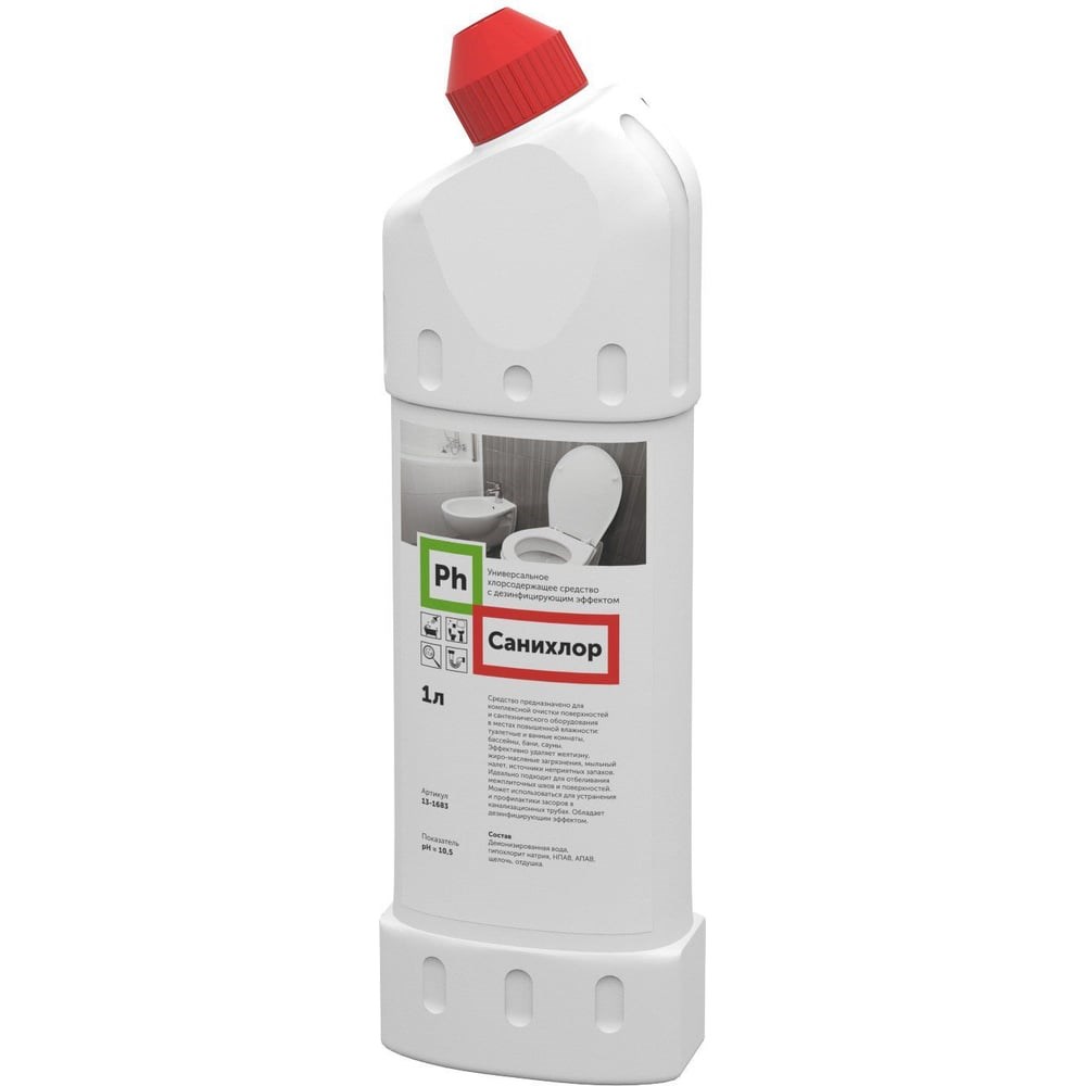 Санихлор PH 1л 13-1683 для очистки поверхностей и сантехнического оборудования в местах повышенной влажности: туалетные и ванные комнаты, бассейны, бани, сауны. Средство обладает дезинфицирующим эффектом и удаляет желтизну, жиро-масленые загрязнения, мыльный налет, источники неприятных запахов. Концентрат универсален и может использоваться для устранения и профилактики засоров в канализационных трубах.