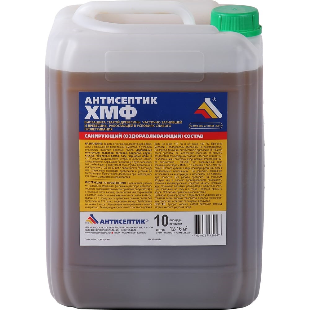 Санирующий антисептик ЗАО "Антисептик" ХМФ 10 литров 00-00003745 санирует (оздоравливает) древесину, зараженную деревоокрашивающими, дереворазрушающими грибами, поврежденную насекомыми, моллюсками, ракообразными, предотвращает их дальнейшее развитие в условиях слабого проветривания и повышенной пропиточной емкости древесины. Объекты защиты: конструктивные элементы из древесины с повышенной пропиточной емкостью, в том числе старой и частично загнившей. Особенно эффективен для условий возможного развития домовых грибов: деревянные конструкции подвалов, погребов, подполья, срубы, каркасы обшивных домов и т.п.Лесоматериалы и изделия из древесины, пропитанные антисептиком «ХМФ» служат от 25 до 40 лет в зависимости от поглощения (удержания) защитного средства древесиной и условий ее эксплуатации. Состав наносится на деревянные конструкции подвалов, погребов, подполья, срубы, каркасы обшивных домов.