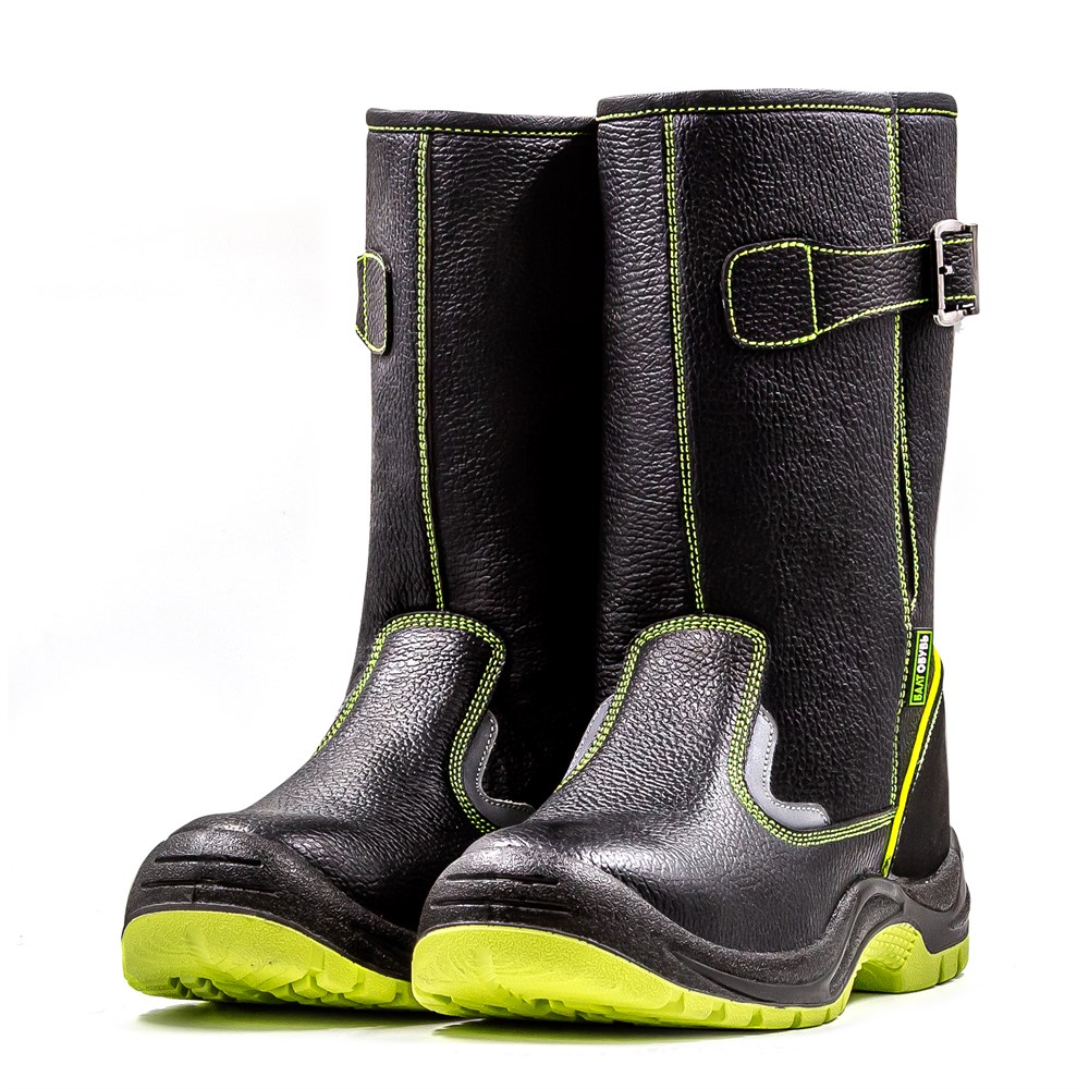 Защитные сапоги на двухслойной ПУ/ТПУ (термополиуретановой) подошве изготовлены из натуральной юфтевой кожи устойчивой к воздействию агрессивных внешних факторов. Носок защищен металлическим подноском с ударной нагрузкой до 200 Дж. Подошва изготовлена литьевым методом, устойчива к воздействию кислотно-щелочных веществ (до 20%), масло-бензольных соединений и нефтепродуктов. Рабочая температура эксплуатации ботинок от -35°С до +85°С. Дополнительный комфорт для ног и защиту от ударных нагрузок обеспечивают амортизатор в пяточной части ботинка, усиленный протектор и дополнительная защита носовой части. Анатомическая стелька из ЭВА обеспечивает комфорт носки и снижает нагрузку на стопу .