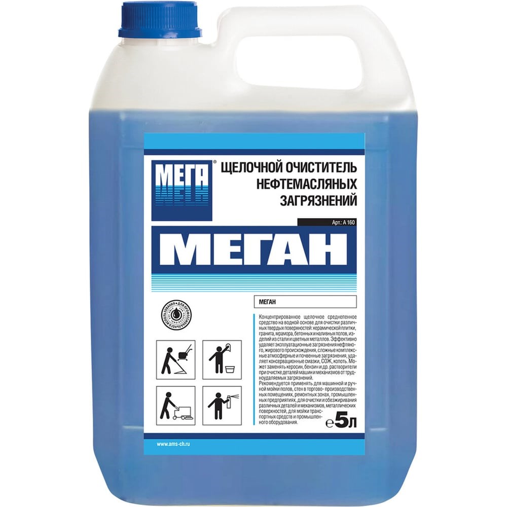 Средство для удаления нефтемаслянных загрязнений МЕГАН 5 л,щелочное, А 160 604338 представляет собой концентрированный состав на водной основе без отдушек, который образует умеренное количество пены при растворении.Широко применяется в сфере профессионального клининга в промышленных, торговых, административных помещениях, автосервисах и на предприятиях по пищевому производству.Раствор подходит для устранения пятен грязи, жира, смазки и копоти с поверхностей деталей и различных механизмов.Препарат так же используется при ручной и машинной очистке стен, линолеума, керамической плитки и других видов напольных покрытий.