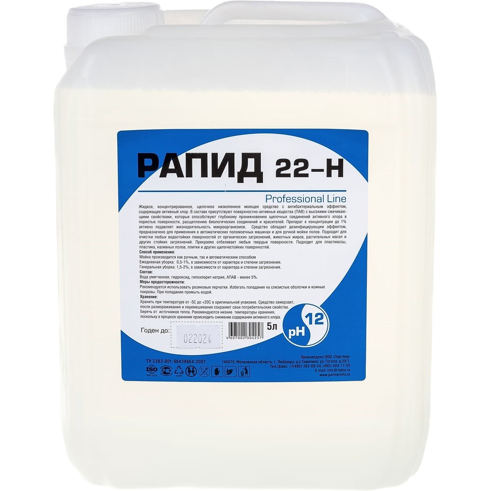 Щелочное низкопенное моющее средство с активным хлором для уборки и дезинфекции РАПИД 22-Н подходит для очистки от органических загрязнений, животных жиров, растительных масел. Поверхностно-активные вещества с высокими смачивающими свойствами способствуют глубокому проникновению щелочных соединений активного хлора, расщеплению биологических соединений и красителей. Препарат в концентрации до 1% активно подавляет жизнедеятельность микроорганизмов.Средство используется в автоматических поломоечных машинах и для ручной мойки.Подходит для наливных полов, плитки, пластмассы, пластика и других щелочестойких поверхностей.
