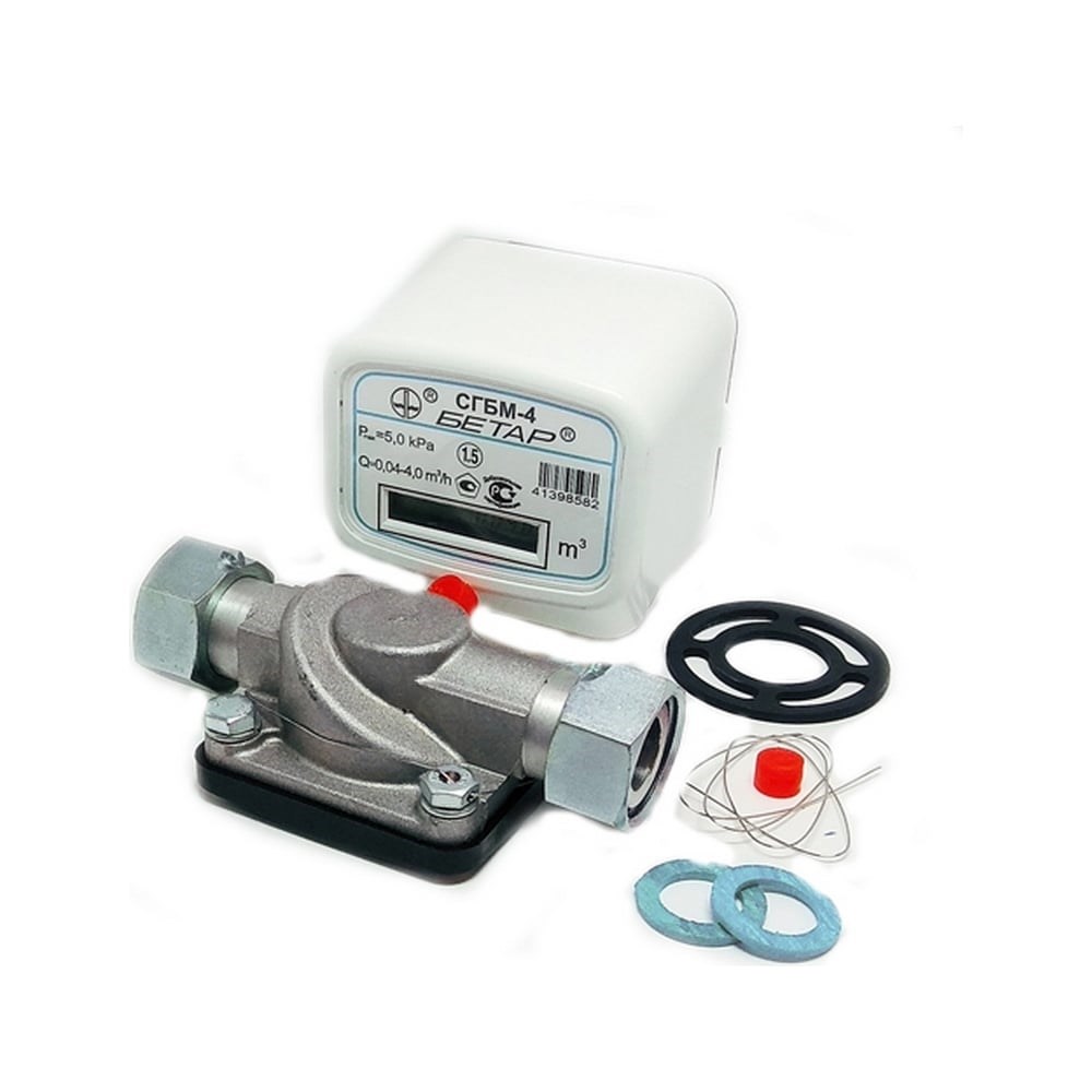 Счетчик газа с двумя накидными гайками Бетар СГБМ-4.0 Бет.4.0-2гайки предназначен для организации учёта потребления объёма газовой смеси в бытовых условиях. Он относится к категории малогабаритных приборов струйного типа. Его используют в городских квартирах, загородных домах и коттеджах. Прибор имеет все разрешительные документы для установки в газовых сетях жилищно-коммунального хозяйства. Обладает классом точности равным 1,0 или 1,5 и способен проводить измерения объёма расходуемой газовой смеси от 0,04 до 4 кубических метров в час. Межповерочный интервал и срок службы Этот интервал равен сроку службы и интервалу в 12 лет. Счетчик имеет отсчетное устройство в виде жидкокристаллического индикатора, на котором цифры слева до точки показывают объем газа в кубических метрах, а три цифры после точки соответственно в десятых, сотых и тысячных долях кубического метра. СГБМ-4 устанавливается без применения сварочных работ, как в горизонтальном, так и в вертикальном положении.