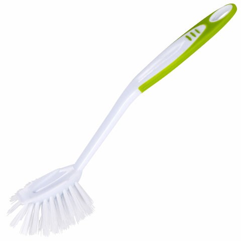 Подходящая степень жесткости щетины для чистки различного рода загрязнений. Благодаря специальной форме она способна очистить труднодоступные места. Эргономичная нескользящая ручка благодаря с ПВХ-покрытию длиной 25 см. В ручке предусмотрено отверстие для подвешивания. Изготовлена из прочного пластика. Выполнена в белом цвете в сочетании с зелеными элементами.