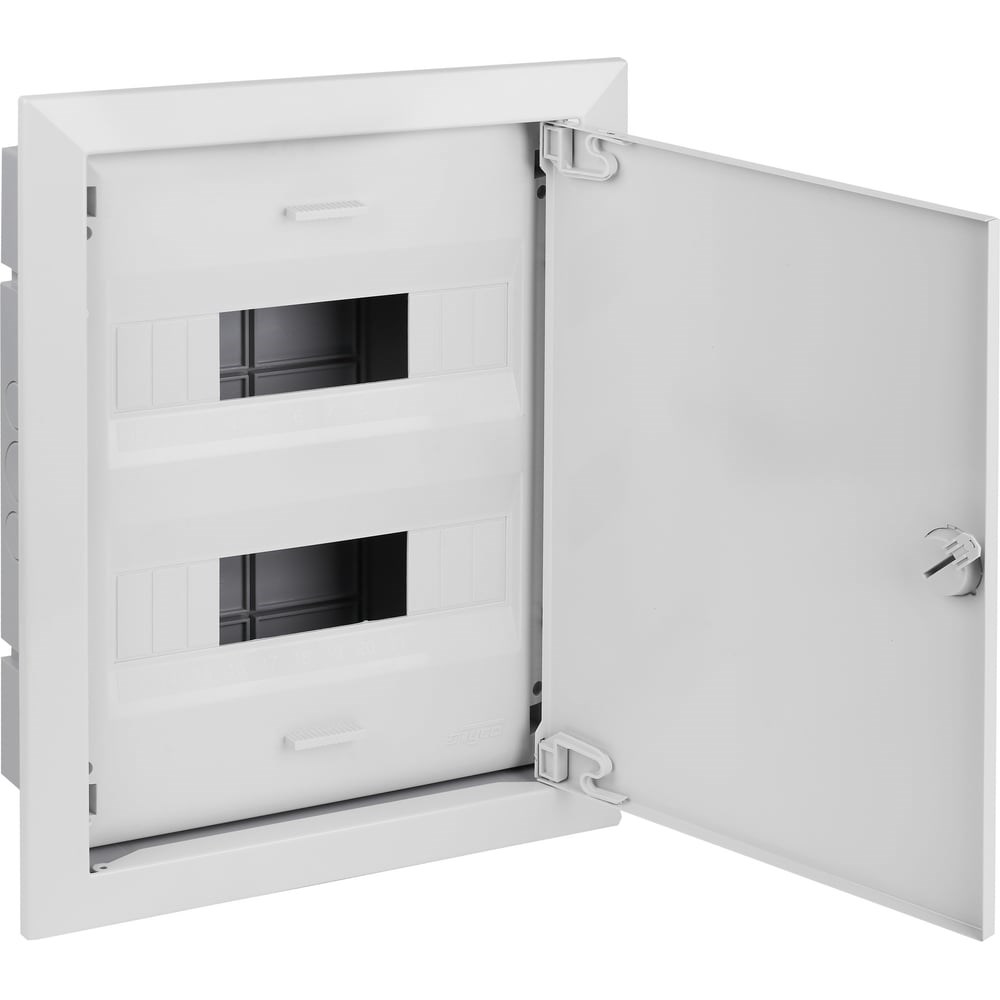 Щиток для скрытой проводки серии “Тусо” на 24 модуля с металлическими рамой и дверцей. Предназначен для монтажа модульных компонентов в жилых, административных и торговых помещениях. Рама и дверца изготовлена из стального листа, обладают противокоррозийной защитой, окрашены специальной краской. Имеют защиту от несанкционированного доступа. Имеют возможность установки замка с ключом вместо дверной поворотной ручки. Температура монтажа: от -25 до +60°С.