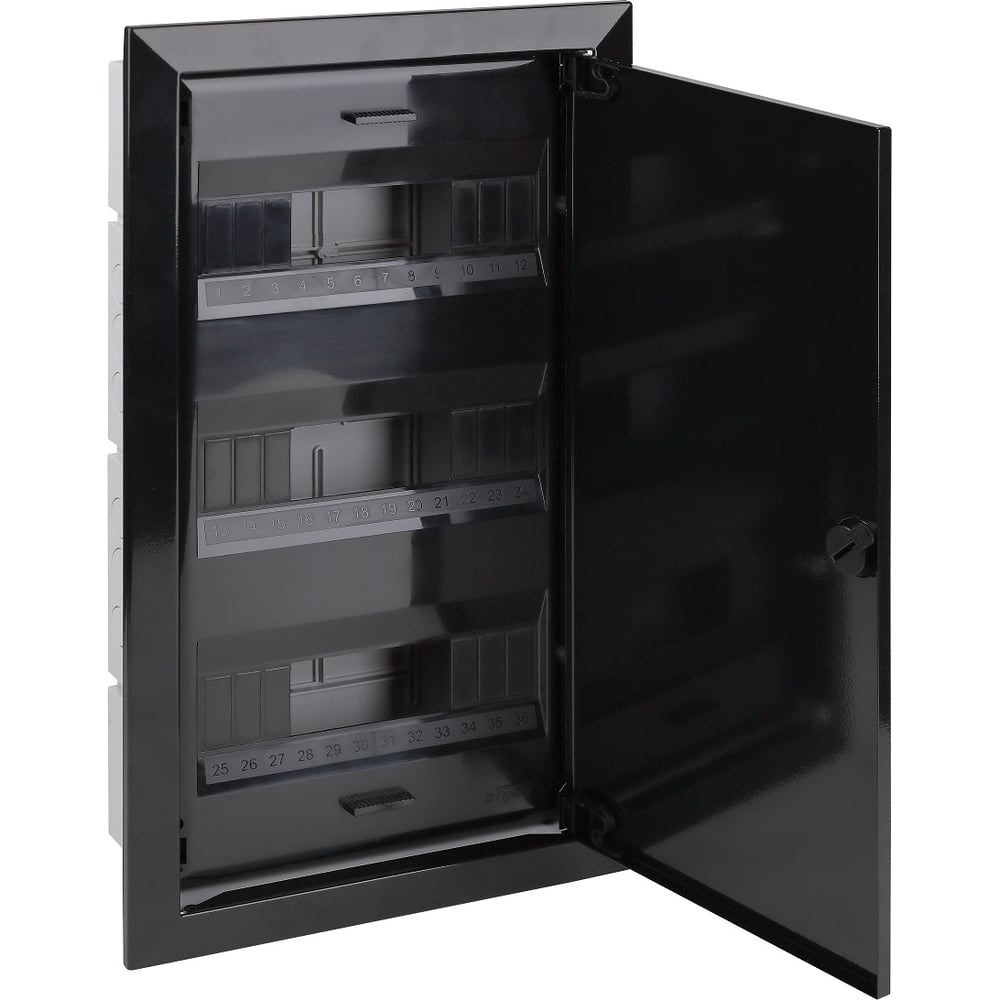 Щиток для скрытой проводки серии “Тусо” на 36 модулей с металлическими рамой и дверцей. Предназначен для монтажа модульных компонентов в жилых, административных и торговых помещениях. Рама и дверца изготовлена из стального листа, обладают противокоррозийной защитой, окрашены специальной краской. Имеют защиту от несанкционированного доступа. Имеют возможность установки замка с ключом вместо дверной поворотной ручки. Температура монтажа: от -25 до +60°С.