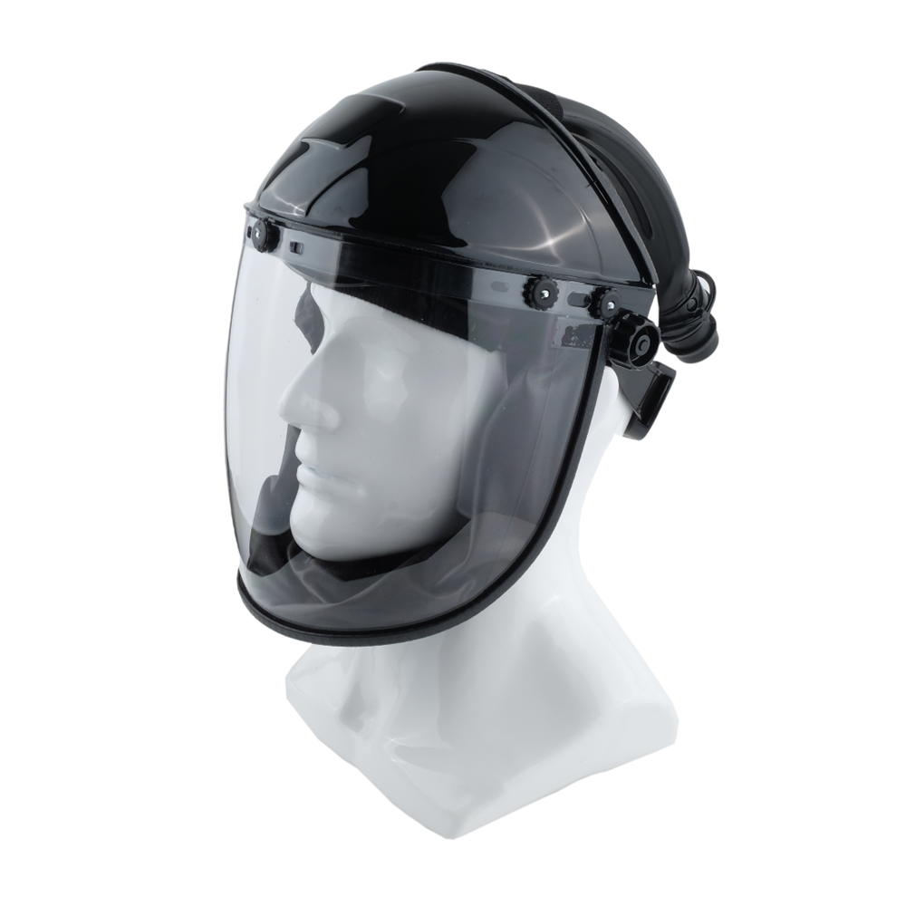 Щиток состоит из бесцветного защитного экрана c антиабразивным покрытием, козырька, наголовного крепления, тканевого лицевого уплотнителя, воздуховода с регулировкой направления подаваемого воздуха. Бесцветный экран увеличенного размера, обеспечивающий защиту от высокоскоростных частиц в температурном диапазоне от -5°С до 55°С, изготовлен из ударопрочного поликарбоната c покрытием АЛМАЗ (сверхтвердое двустороннее химостойкое покрытие высокого качества устойчивое к истиранию и царапинам, сохраняющее свои свойства при сверх интенсивной эксплуатации, в т.ч. при работе с абразивами и загрязняющими веществами). Наголовное крепление Rapid с плавной регулировкой размера. Легкосъемный лицевой уплотнитель из прочной ткани черного цвета обеспечивает частичную изоляцию пространства под экраном от окружающей среды. Предназначен для защиты глаз и лица от механических воздействий, пыли, капель и брызг жидкостей, а также органов дыхания в составе СИЗОД с принудительной подачей воздуха.