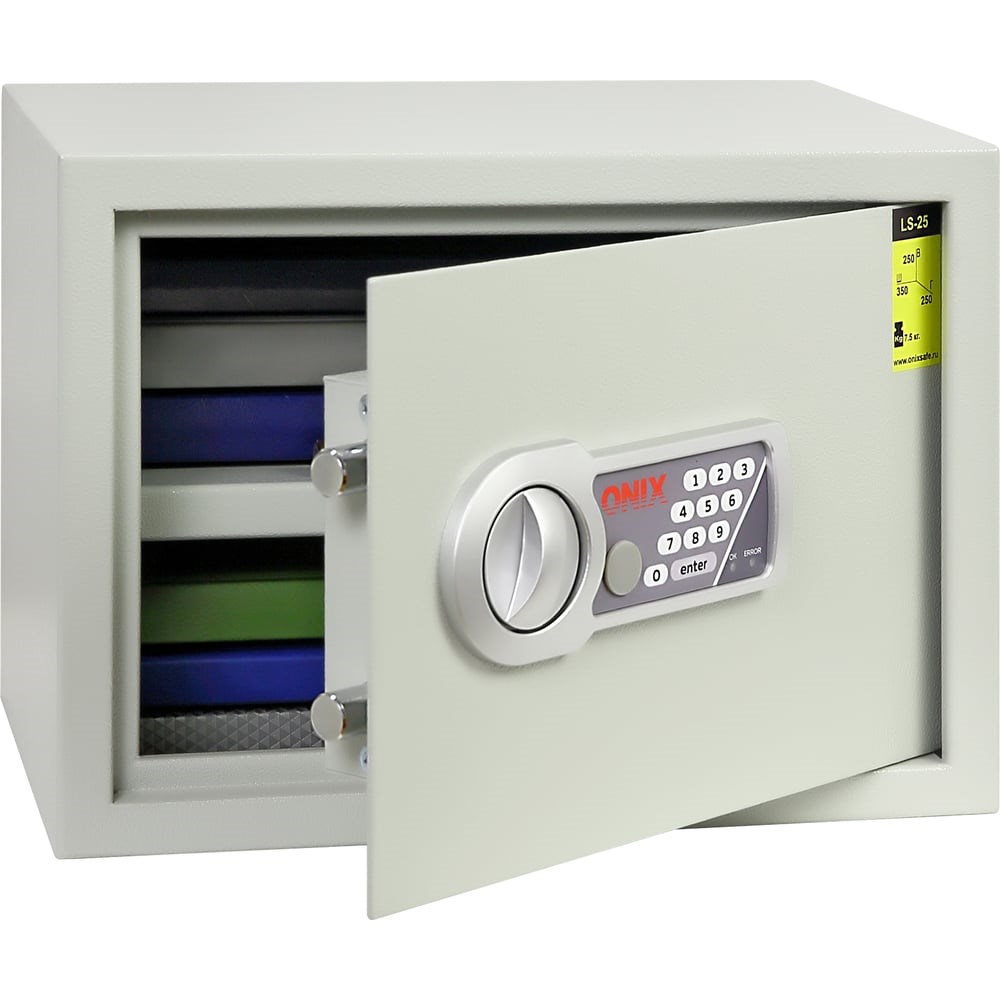 Сейф Onix LS-25 - это прочный стальной шкаф с электронным замком, который позволит защитить денежные средства, документы и ценные вещи от хищения. Внутри корпуса есть полка. Также шкаф оснащен системой защиты от подбора кода и аварийным ключом, который предназначен для открытия сейфа в случае потери кода или в аварийной ситуации.