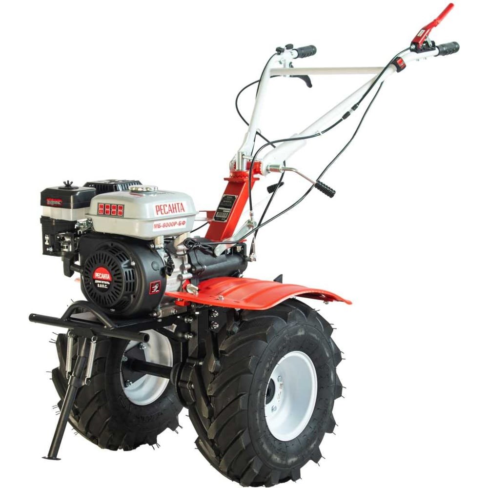 МБ-8000P-БФ Ресанта– сельскохозяйственная машина, служащая для боронования, прополки, рыхления и других видов механической обработки почвы на приусадебных, фермерских, садовых участках. Со стандартными лезвиями ширина обработки 100 см, но есть возможность задавать меньшую ширину для узких полос. С дополнительными лезвиями ширина обработки может быть увеличена. СХМ комплектуется закаленными острыми фрезами диаметром 30 см, легко справляющимися даже с очень твердым грунтом.К мотоблоку легко подходит широкий диапазон навесного оборудования. На активное навесное оборудование мощность передается через ВОМ 14 мм. Мотоблок имеет надежный и экономичный 4-тактный двигатель 8 л.с. с расходом топлива (от АИ-92) 375 гр. на кВт⋅ч. Бензобак объемом 3,6 л. рассчитан на длительное время работы на одной заправке.Редуктор защищен надежным чугунным корпусом, крылья защищают оператора и двигатель от разлета земли или пыли. Элементы управления удобно размещены на регулируемых по высоте рукоятках. Машина имеет три передачи: 2 вперед и 1 назад. При застревании в грунте мотоблок легко вытягивается задним ходом. Модель МБ-8000P-БФ оснащена большими колесами 19х7-8, что позволит не застревать на любом типе грунта.