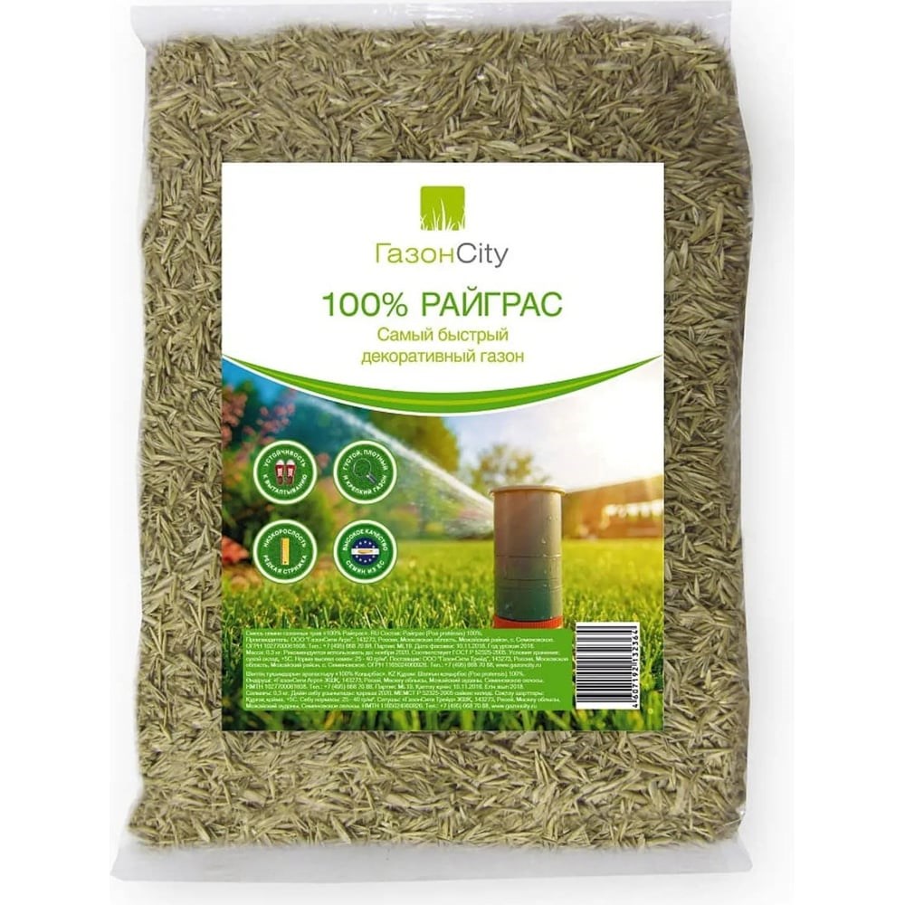 Семена газона ГазонCity Райграс 100% 0.3 кг 201020 - посадочный материал для выращивания моногазона из райграса пастбищного. Газон быстро всходит и образует "зеленый ковер" красивого изумрудного цвета. Семена адаптированы к российским климатическим и почвенным условиям. Газон устойчив к вытаптыванию и высоким нагрузкам, выдерживает холодные зимы и засуху. Райграс хорошо переносит стрижку, быстро и равномерно отрастает. Поверхностная корневая система позволяет укрепить грунт на обочинах и небольших склонах.