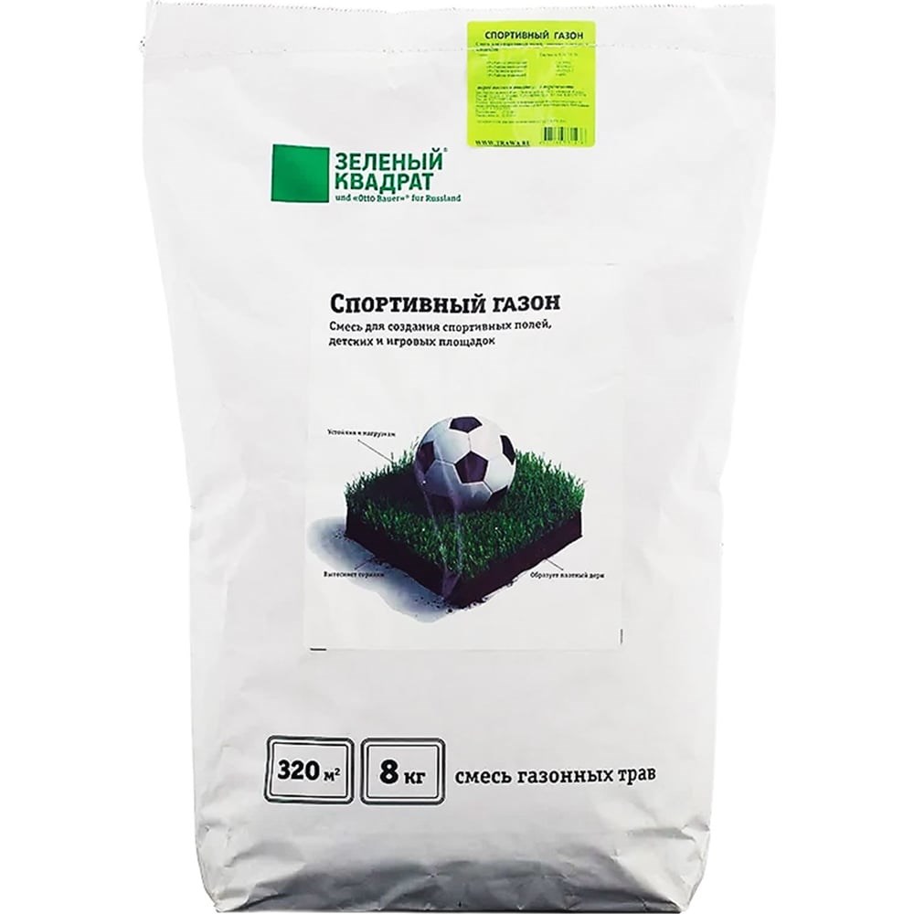 Зеленый Квадрат СПОРТИВНЫЙ - смесь для спортивных полей, детских и игровых площадок.Вес - 8 кг, площадь посева - 320 м2.- Устойчив к нагрузкам - Вытесняет сорняки - Образует плотный дернСостав:Овсяница красная красная 20% Тимофеевка луговая 30% Райграс многолетний 30% Мятлик луговой 10% Райграс итальянский 10%Рекомендуемый срок реализации: 2 года В течение двух лет семена не утрачивают потребительские качества, в дальнейшем всхожесть снижается на 1-2% в год, соответствует ГОСТ Р 52325-2005